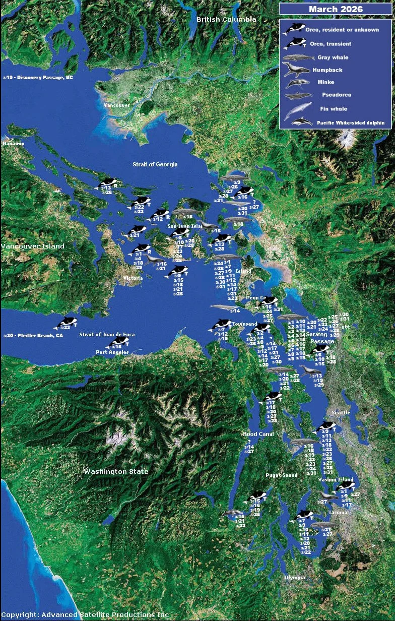 Mon, Apr 20 - Deception Pass/Saratoga Passage/Possession Sound (T90s, T167A, T167B) - T90B Piglet - T167A Doniol - T90s, T167A & T167B as seen today. Link to more photos. -photos by Jason Luc, April 20, 2026